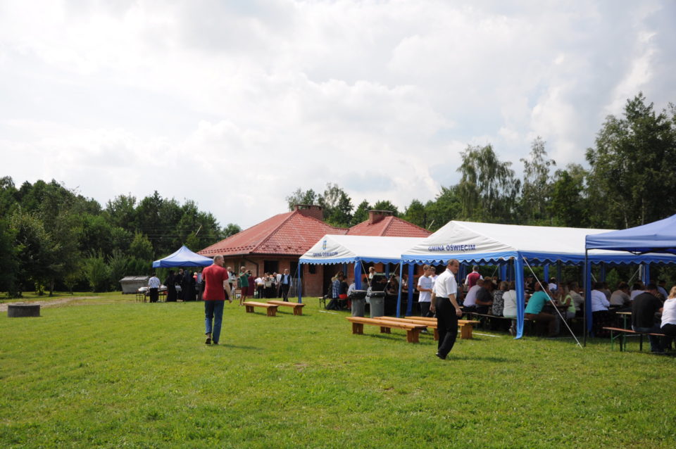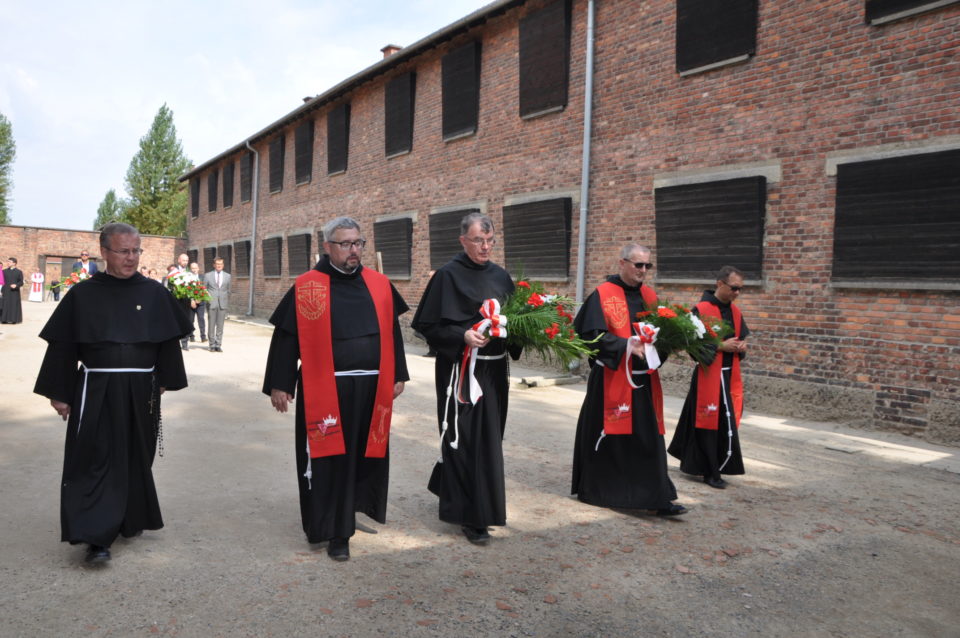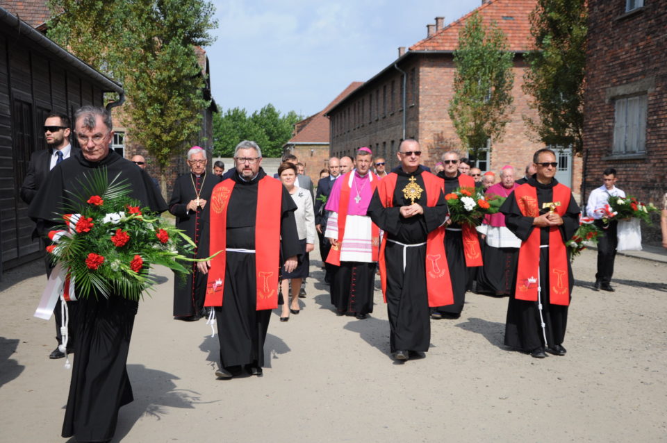 Przed liturgią do Miejsca Pamięci dotarły dwie pielgrzymki: z franciszkańskiego Centrum w Harmężach i z kościoła pw. św. Maksymiliana Kolbego w Oświęcimiu. Wierni i duchowni z dwóch grup wspólnie przeszli pod Blok 11. Pod Ścianą Straceń kwiaty złożyła prezes rady ministrów Beata Szydło. Także hierarchowie złożyli wiązanki kwiatów i zapalili znicze w miejscu, gdzie Niemcy rozstrzelali tysiące więźniów. Wraz z duchownymi hołd pomordowanym ofiarom obozu złożyli też m.in. przedstawiciele Rycerstwa Niepokalanej, Misjonarki Niepokalanej z Harmęż, przedstawiciele władz samorządowych. Kwiaty i znicze pojawiły się też pod tablicą pamiątkową na placu apelowym – miejscu, gdzie 75 lata temu o. Kolbe zgłosił gotowość pójścia na śmierć za innego więźnia.