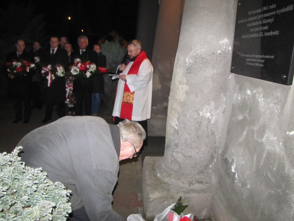 W uroczystościach rocznicowych wzięli udział m.in: przedstawiciel wysiedlonych Leon Zieliński, zastępca dyrektora PMAB Anna Skrzypińska, ze Starostwa Powiatowego radny Adam Sowa, Z Gminy Oświęcim p. wicewójt Mirosław Smolarek, wiceprzewodniczący rady gminy Krzysztof Harmata, ZSP Harmęże Bartłomiej Karolus oraz Sołtys Harmęż Edyta Bogusz.