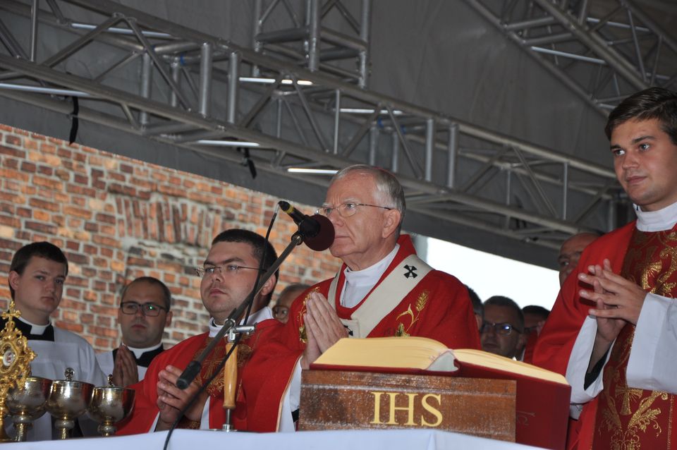 Arcybiskup nawiązał do „Kliszy pamięci” Mariana Kołodzieja, który został przywieziony do Auschwitz w pierwszym transporcie. W obozie spotkał o. Maksymiliana i dzięki rozmowie z nim, zrozumiał, że Bóg również cierpiał w Auschwitz i nigdy nie opuścił swoich wiernych. Metropolita przywołał także papieskie słowa, wygłoszone na Błoniach w 1979 roku: „Człowiek jest wolny. Człowiek może powiedzieć Bogu: nie. Człowiek może powiedzieć Chrystusowi: nie. Ale – pytanie zasadnicze: czy wolno? I w imię czego <<wolno>>? Jaki argument rozumu, jaką wartość woli i serca można przedłożyć sobie samemu i bliźnim, i rodakom, i narodowi, ażeby odrzucić, ażeby powiedzieć <<nie>> temu, czym wszyscy żyliśmy przez tysiąc lat?! Temu, co stworzyło podstawę naszej tożsamości i zawsze ją stanowiło. Kiedyś Chrystus zapytał apostołów (było to po zapowiedzi ustanowienia Eucharystii, gdy różni odsuwali się od Niego): <<Czyż i wy chcecie odejść?>>. Pozwólcie, że następca Piotra powtórzy dzisiaj wobec was wszystkich tu zgromadzonych – i wobec całych naszych dziejów i całej współczesności… że powtórzy dziś słowa Piotra – słowa, które wówczas były jego odpowiedzią na pytanie Chrystusa: <<Panie, do kogóż pójdziemy? Ty masz słowa życia wiecznego>>”.