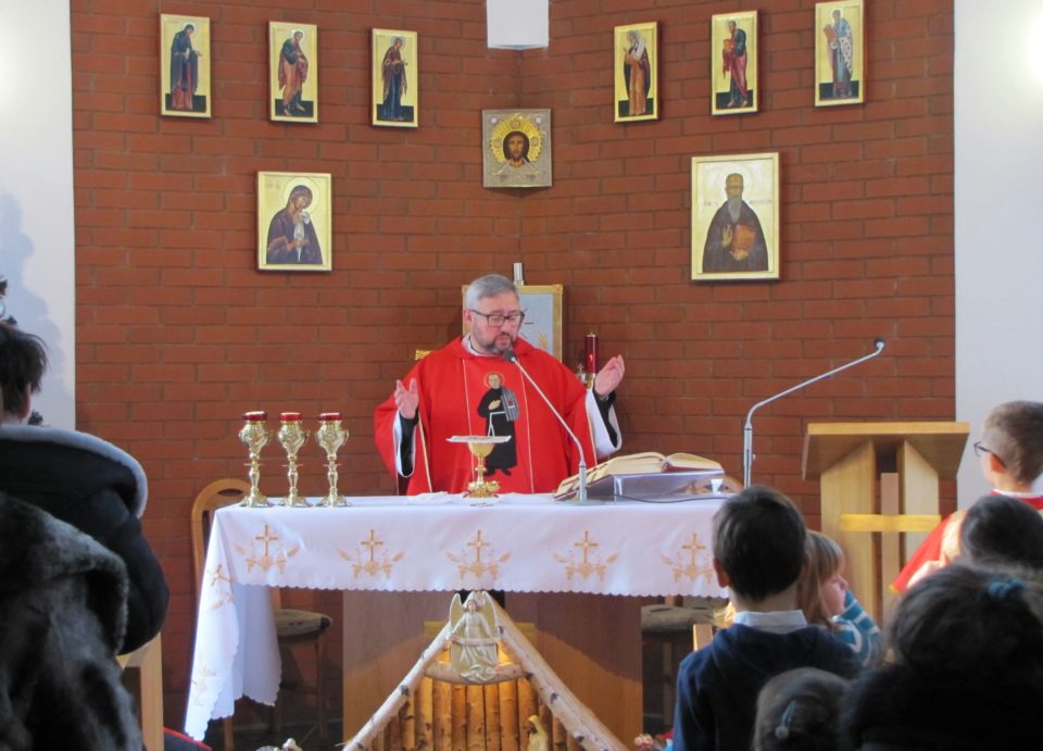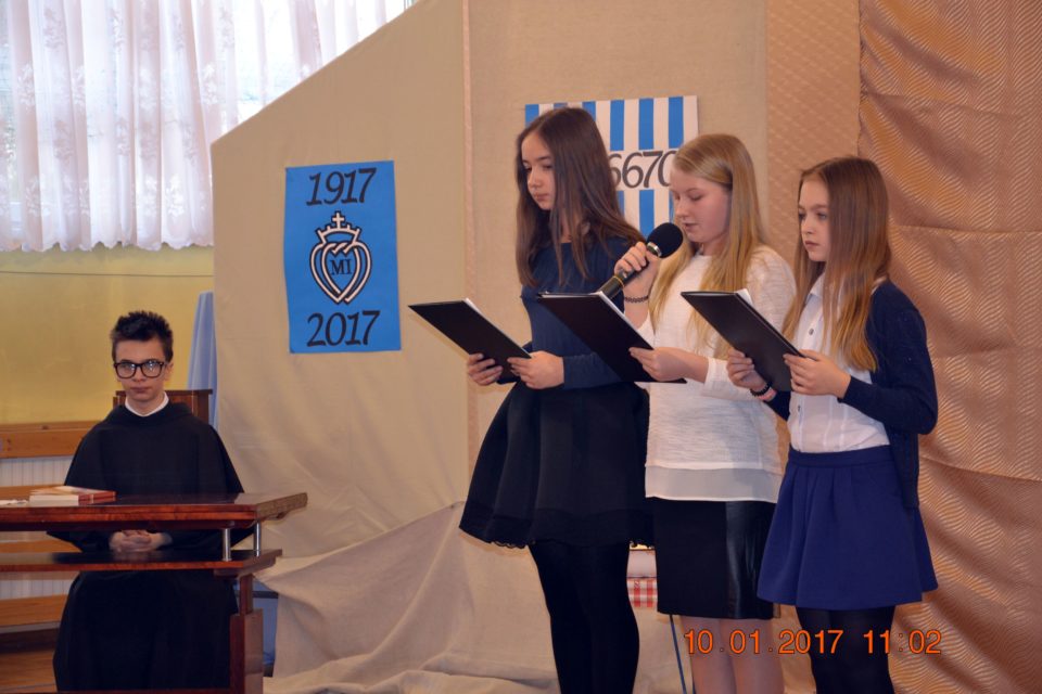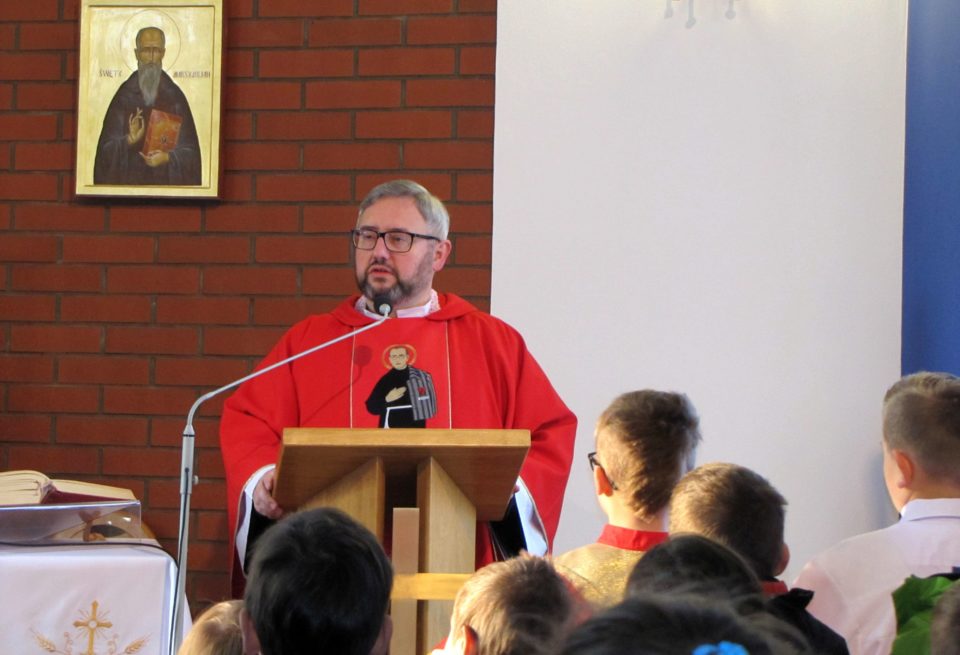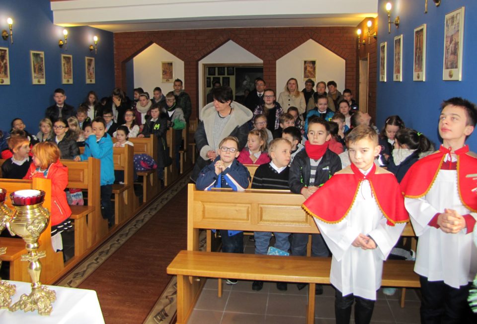 Wyjątkowy dzień dla szkolnej społeczności rozpoczęliśmy od udziału we mszy świętej. Na dalszą część obchodów zaprosiliśmy Gości do sali Domu Ludowego w Harmężach. Nasze zaproszenie przyjęli: o. dr Piotr Cuber OFMConv-gwardian, asystent prowincjalny MI, proboszcz Parafii p.w. Matki Bożej Niepokalanej w Harmężach, pan Mirosław Smolarek-Zastępca Wójta Gminy Oświęcim, pani Halina Musiał-dyrektor Samorządowego Centrum Usług Wspólnych Gminy Oświęcim, Misjonarki Niepokalanej Ojca Kolbego, pani Urszula Fajczyk – redaktor kwartalnika ,,Polanin”, nauczyciele gminnych szkół, przedstawiciele Rady Rodziców, rodzice uczestników konkursu.
