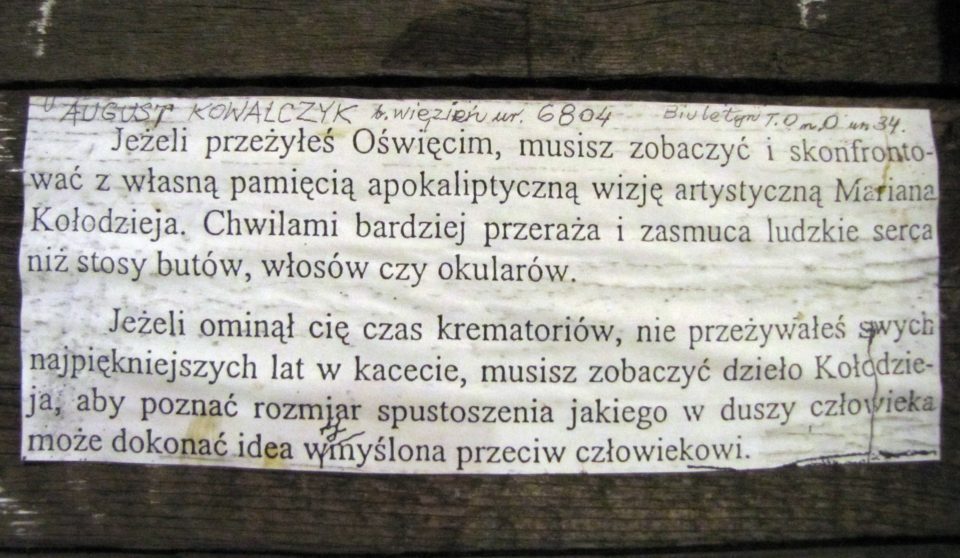 Wiele lat temu podczas pobytu w Oświęcimiu spotkali Mariana Kołodzieja i jego żonę Halinę. Ich kontakt, ze sztuką obozową Kołodzieja pozostawił niezatarte piętno. Od tamtej pory co rok przybywają do Harmęż medytując prace Mistrza.