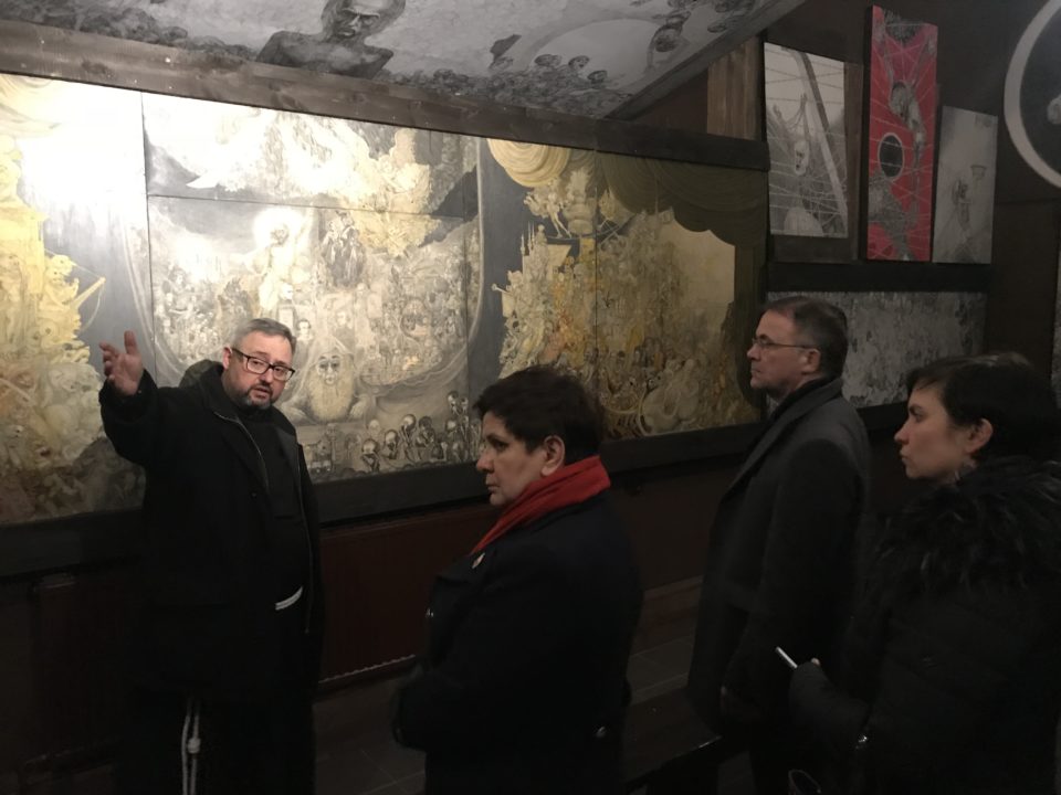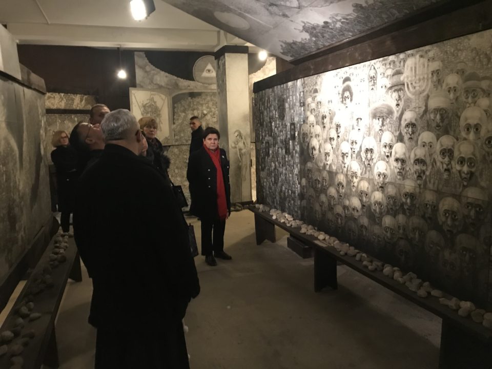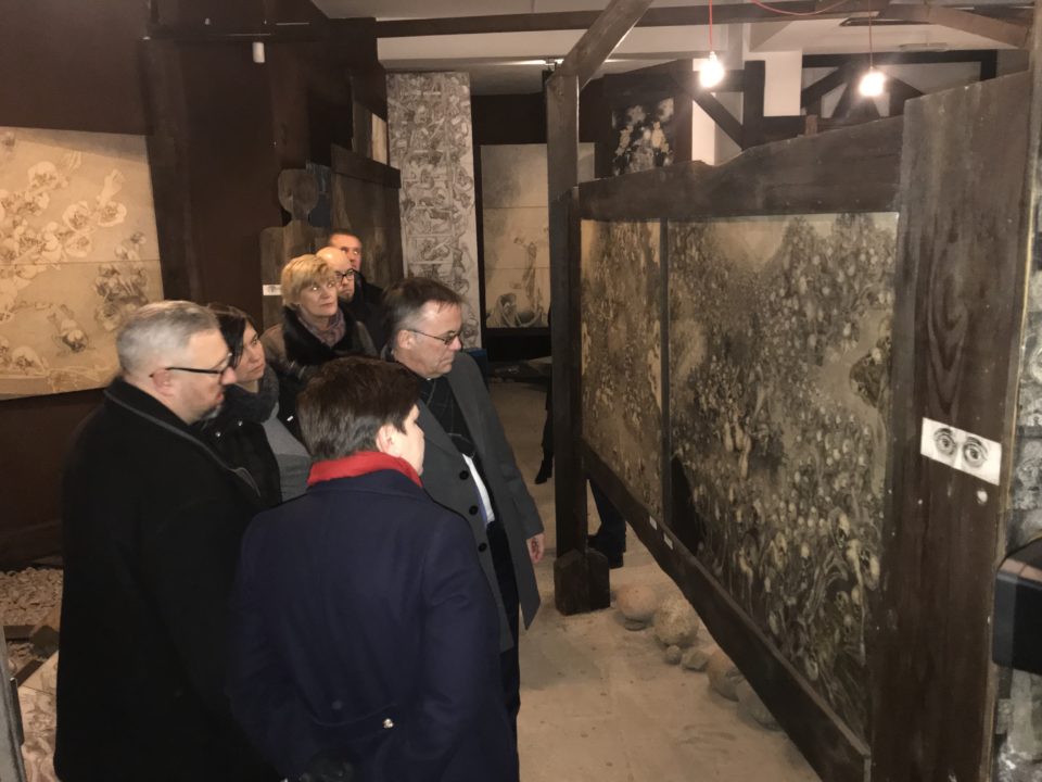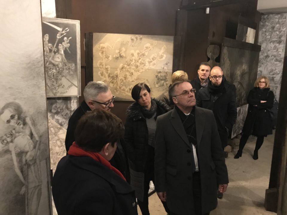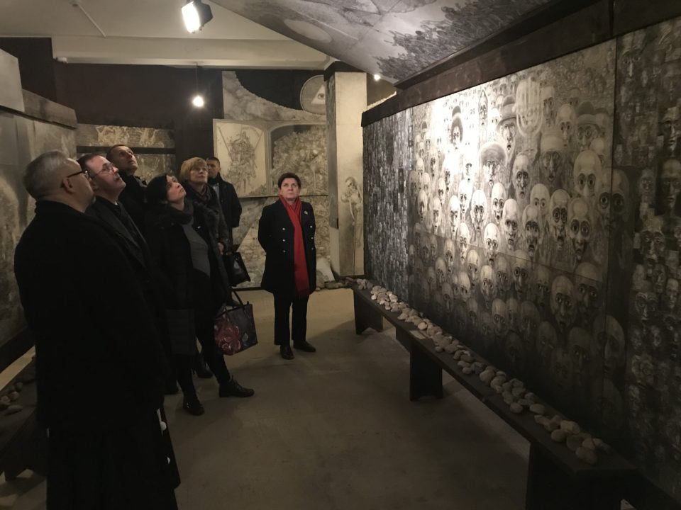 Celem wizyty było obejrzenie wystawy „Klisze pamięci. Labirynty” więźnia pierwszego transportu do KL Auschwitz Mariana Kołodzieja (nr 432). Od 1997 r. ekspozycja znajduje się w podziemiach kościoła Matki Bożej Niepokalanej w Harmężach, w miejscu, gdzie przed ponad 70. laty znajdował się podobóz pracy obozu Auschwitz-Birkeanu.