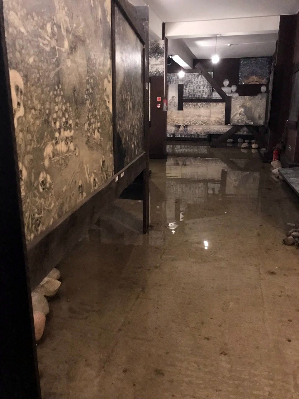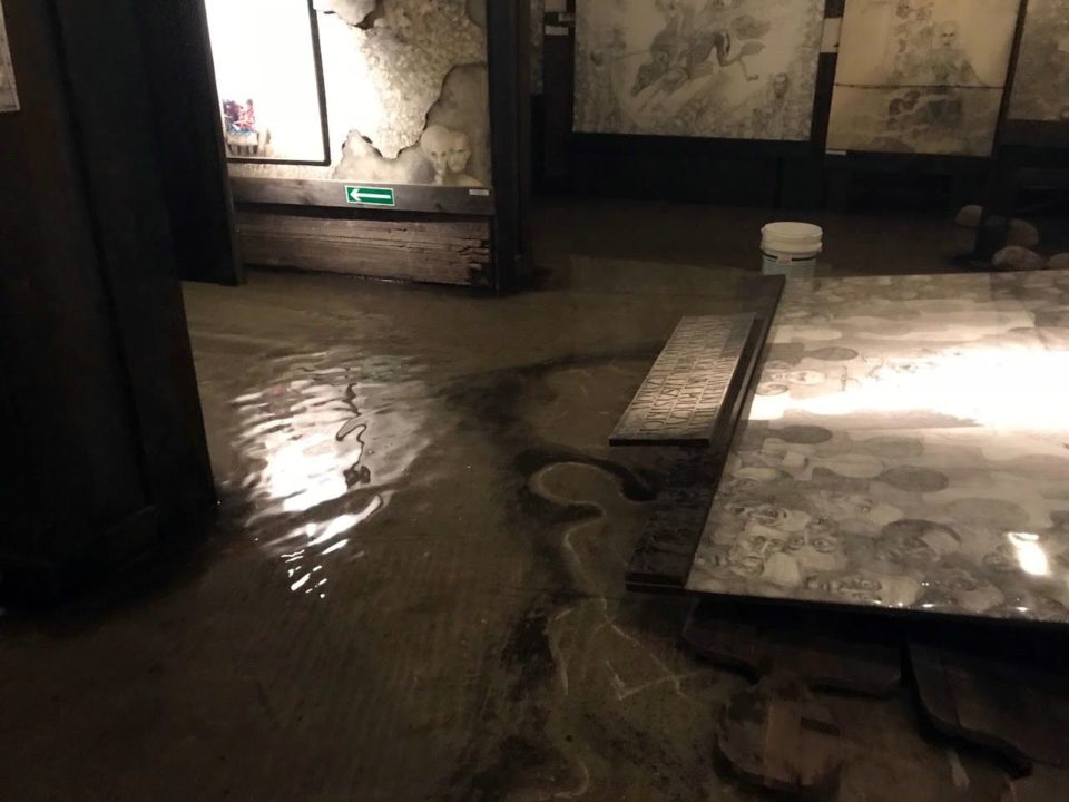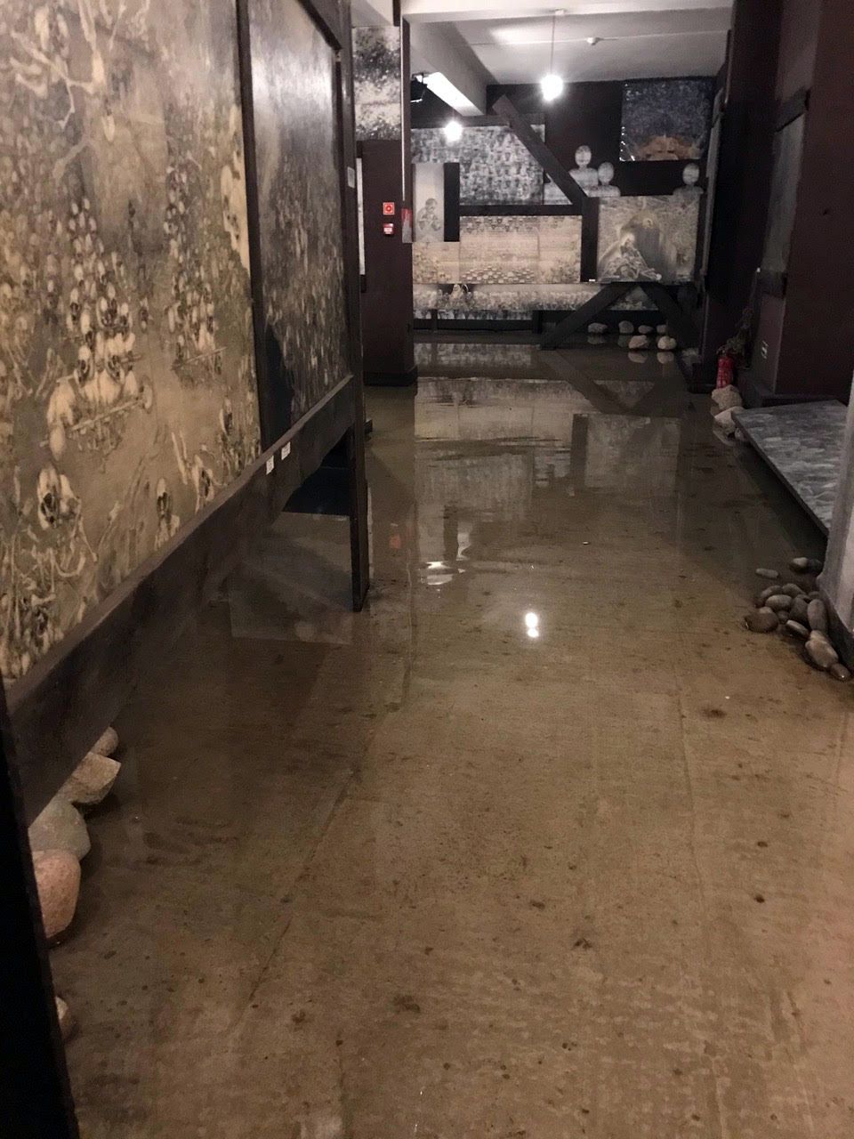 Obecnie trwa osuszanie pomieszczeń wystawy. Jutro konserwatorzy przystąpią do dezynfekcji części drewnianych nasiąkniętych wodą. Na obecnym etapie wystawie nie zagraża niebezpieczeństwo.