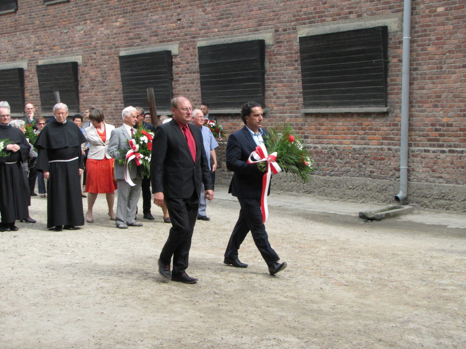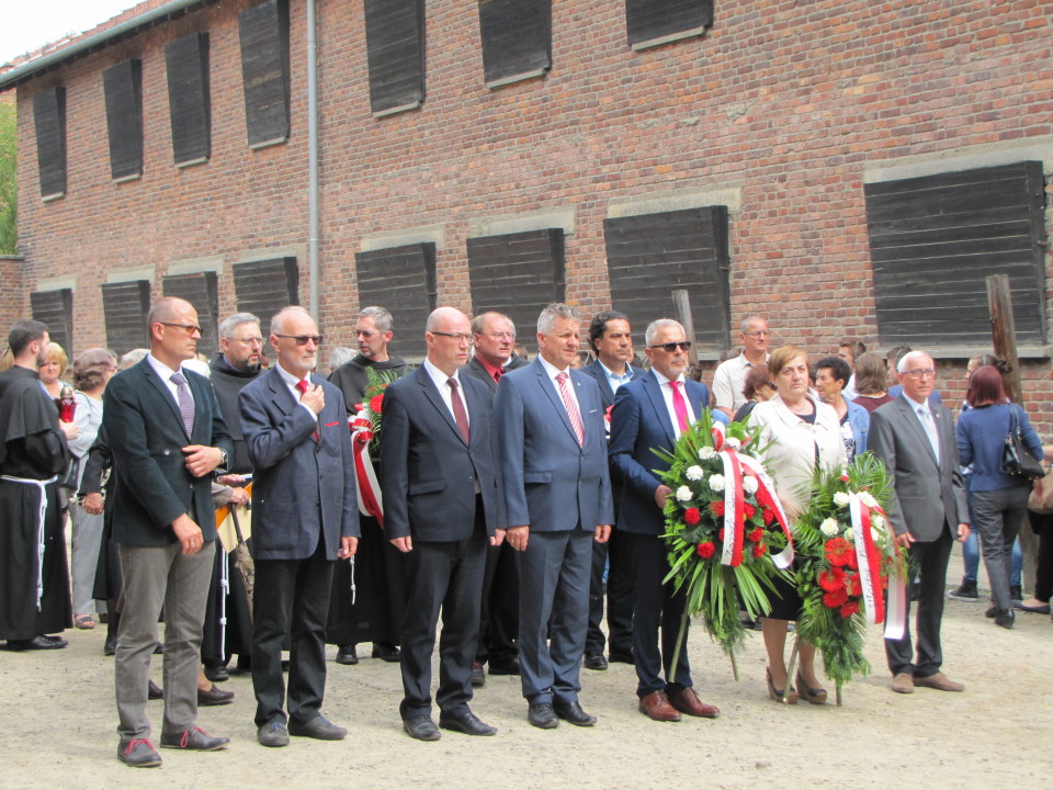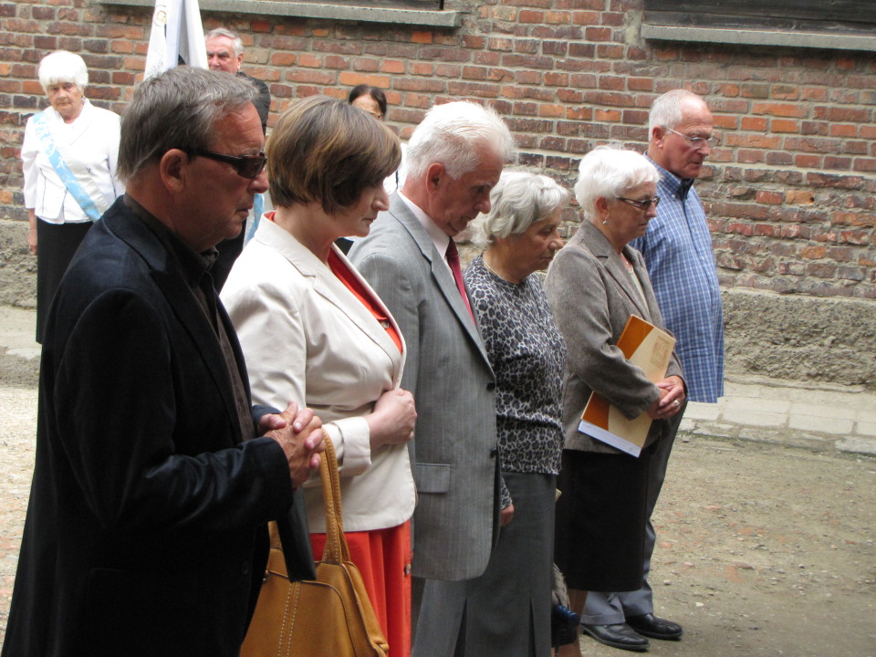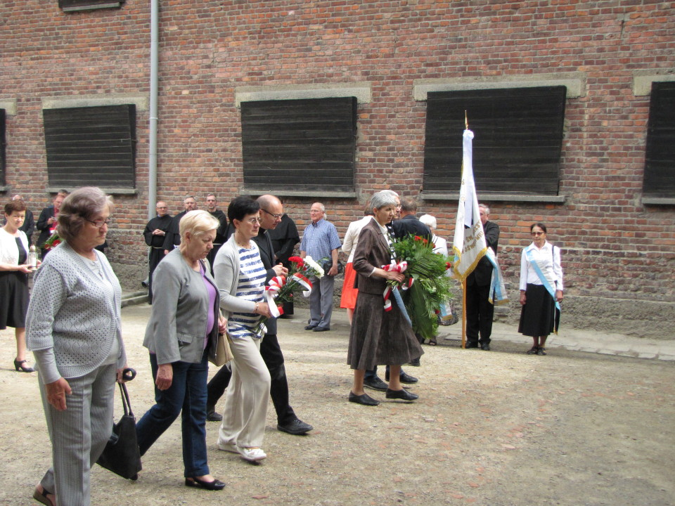 Modlitwa przy Ścianie Śmierci i złożenie kwiatów w celi św. Maksymiliana w byłym niemieckim obozie Auschwitz-Birkenau